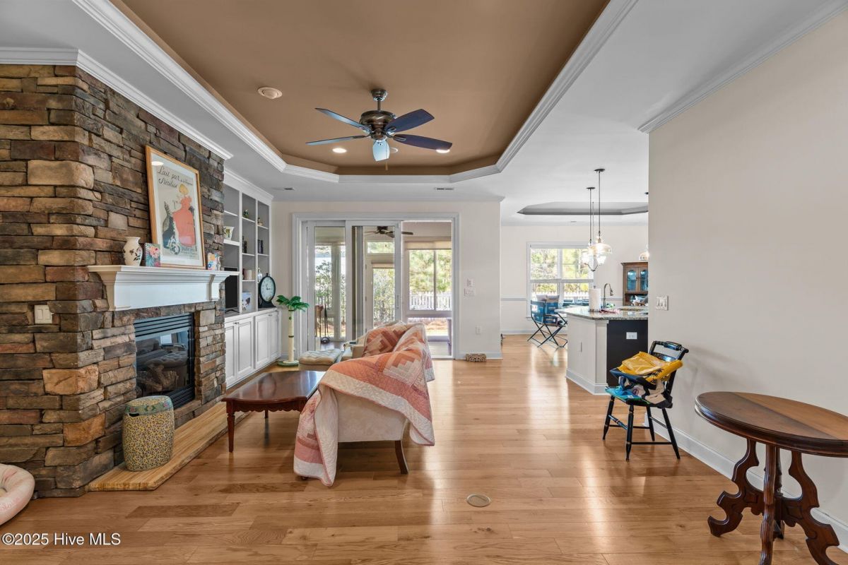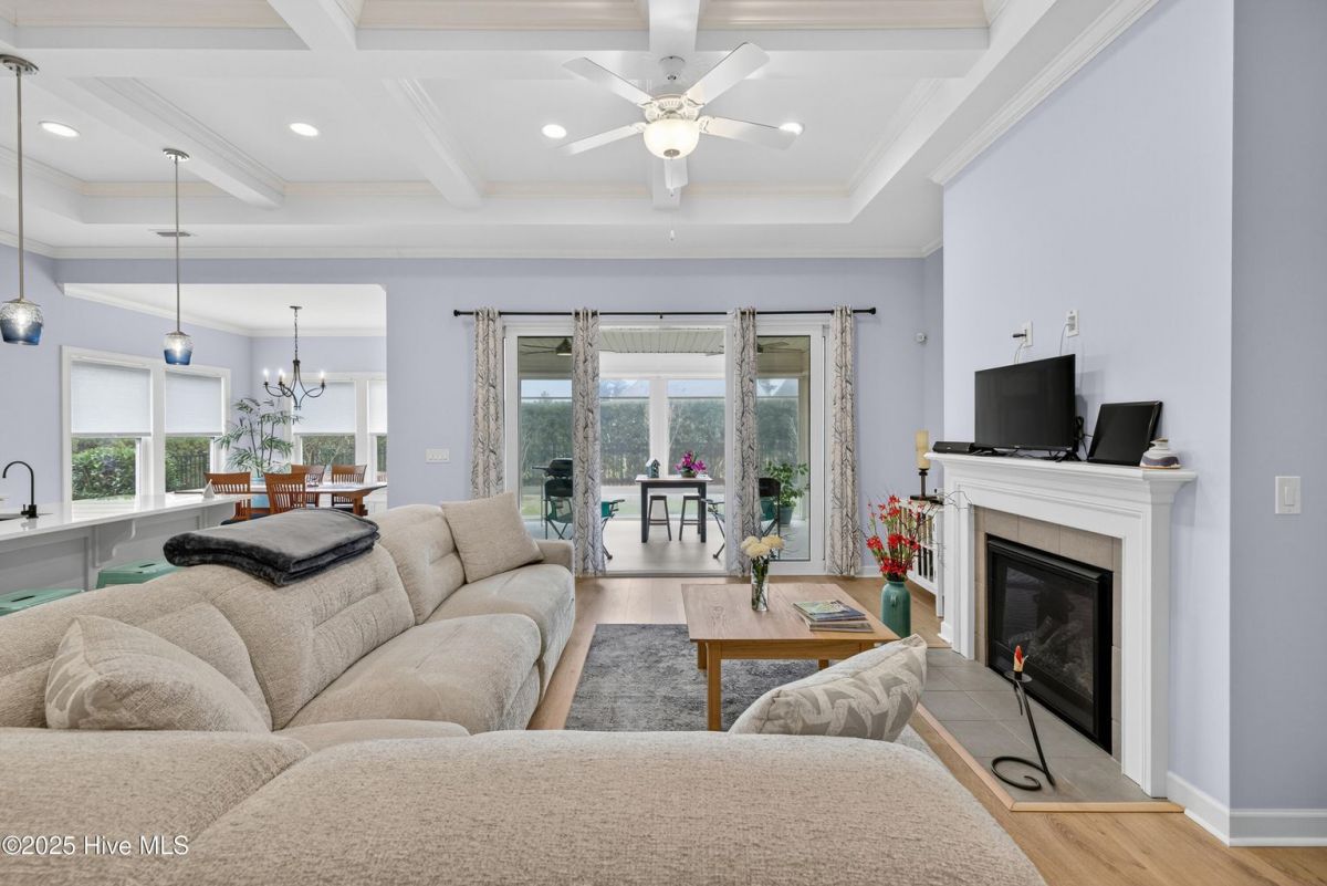 Beautifully maintained home in Parkway Crossing of Brunswick Forest near the Boardwalk Nature Trail featuring 3 bedrooms, 2 full bathrooms, and inviting outdoor living spaces. The open-concept living area includes a coffered ceiling, natural gas fireplace, ...